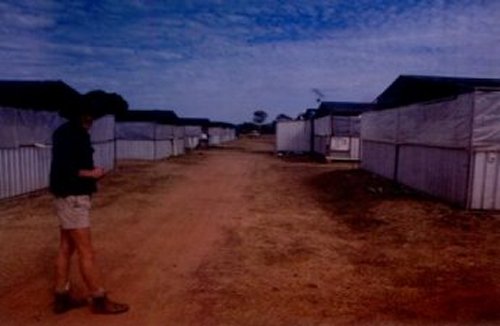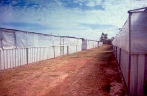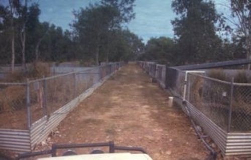 A large section of Janamba Crocodile Farm consists of many rows of small breeding pens like these. A trailer load of dead hens are thrown to the crocs three times a week from a moving vehicle.
