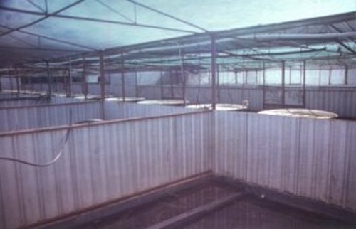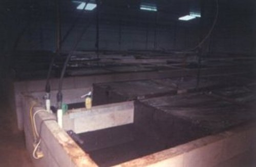 Interior view of the juvenile growing out and grading sheds. In order to stop mutilation occuring in an unnatural and overcrowded situation, the young crocs have to be constantly 'graded' in order to maintain weight and size uniformity on their way to slaughter.