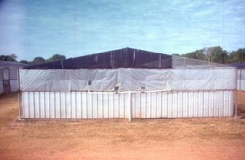 End view of a channel pen constructed from canvas, corrugated iron, steel piping and irrigated with borewater at Janamba Crocodile Farm, Humpty Doo, Northern Territory, Australia.