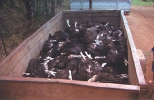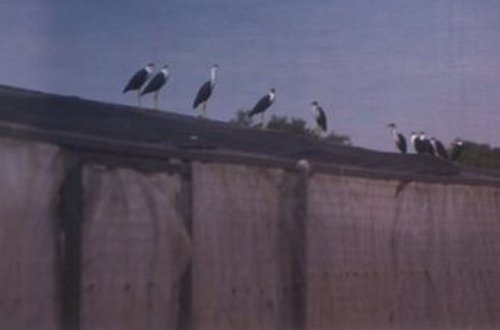 Local birds on the roof of the channel pens attracted by the smell of decaying flesh.