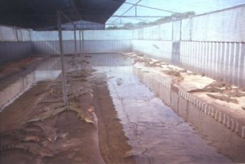 The haunting sight of stagnant water in a breeding pen at Janamba Crocodile Farm at Humpty Doo in the Northern Territory, is a far cry from the salt water crocodile's natural environments of rivers, estuaries and open ocean. Capture and transfer from a natural wilderness area to a farm such as this, is a one way ticket. The unfortunate crocodiles who end up at this farm will die here as well.
